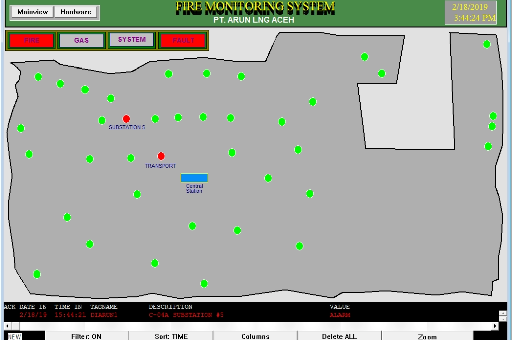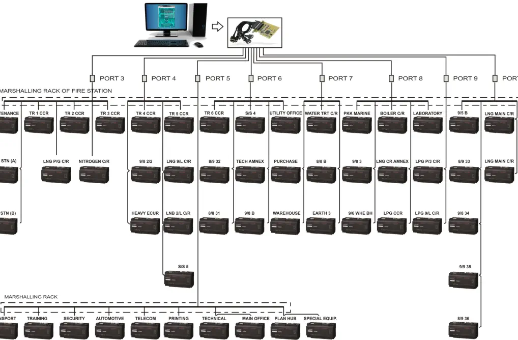 •53 BRODERSEN RTU8 Hardware, Fire•Smoke, Gas Detectors distributed in 700 zones (non addressable)•RS-485 cables•Patton short Haul Modems Interface•Twisted pair cable network up to 8Km radius; •2000 I/Os.•PC with Multiport Digiboard in PCI Slots.
